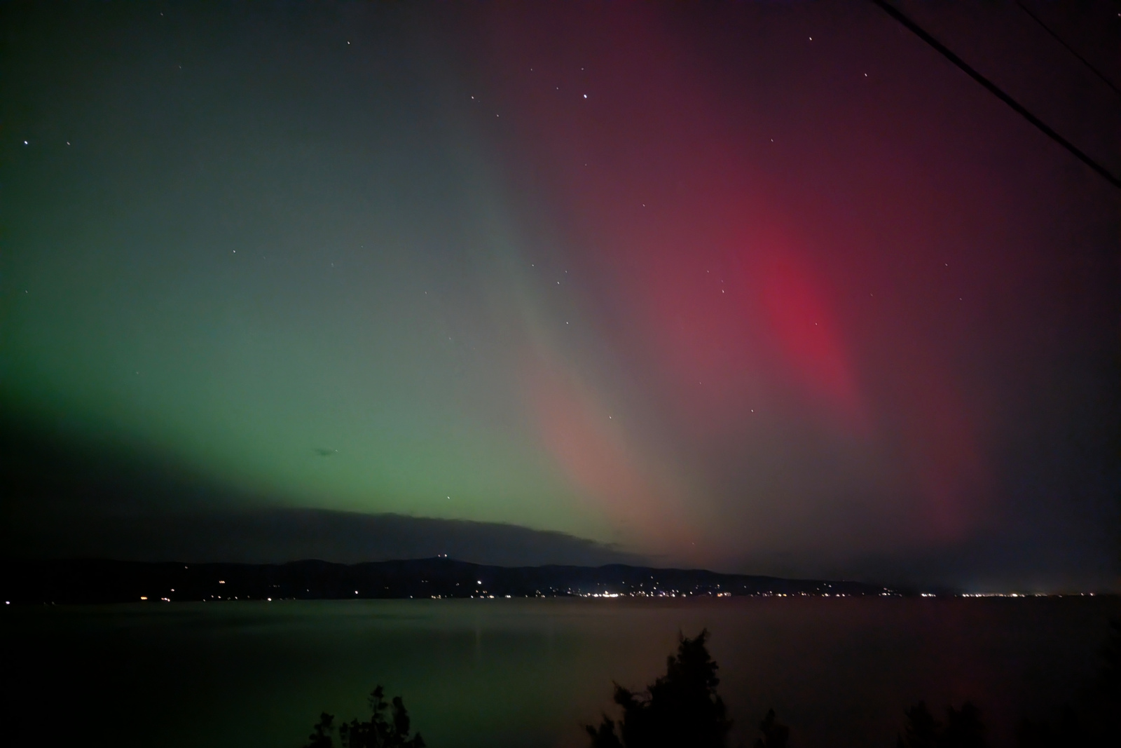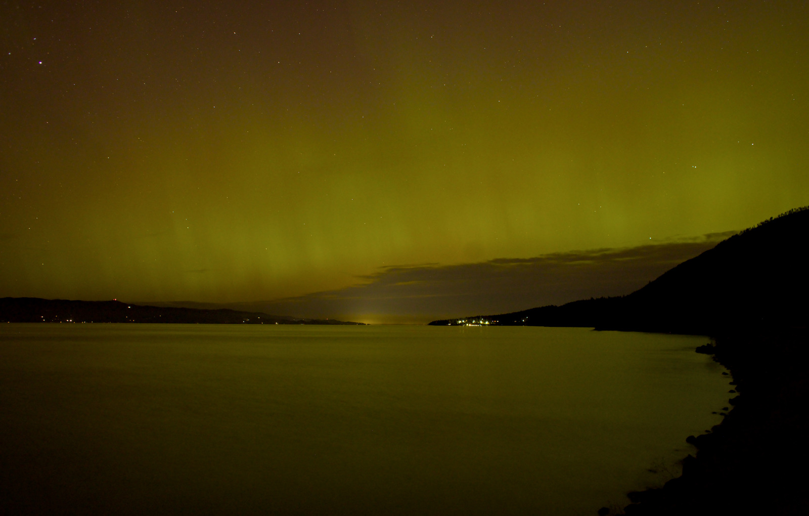 We spent almost two hours driving along the lake shore, stopping at points to capture the sky in different directions. The aurora streaked overhead, basically encompassing the entire sky. It was amazing. Looking south, there was a deeper shade of red: