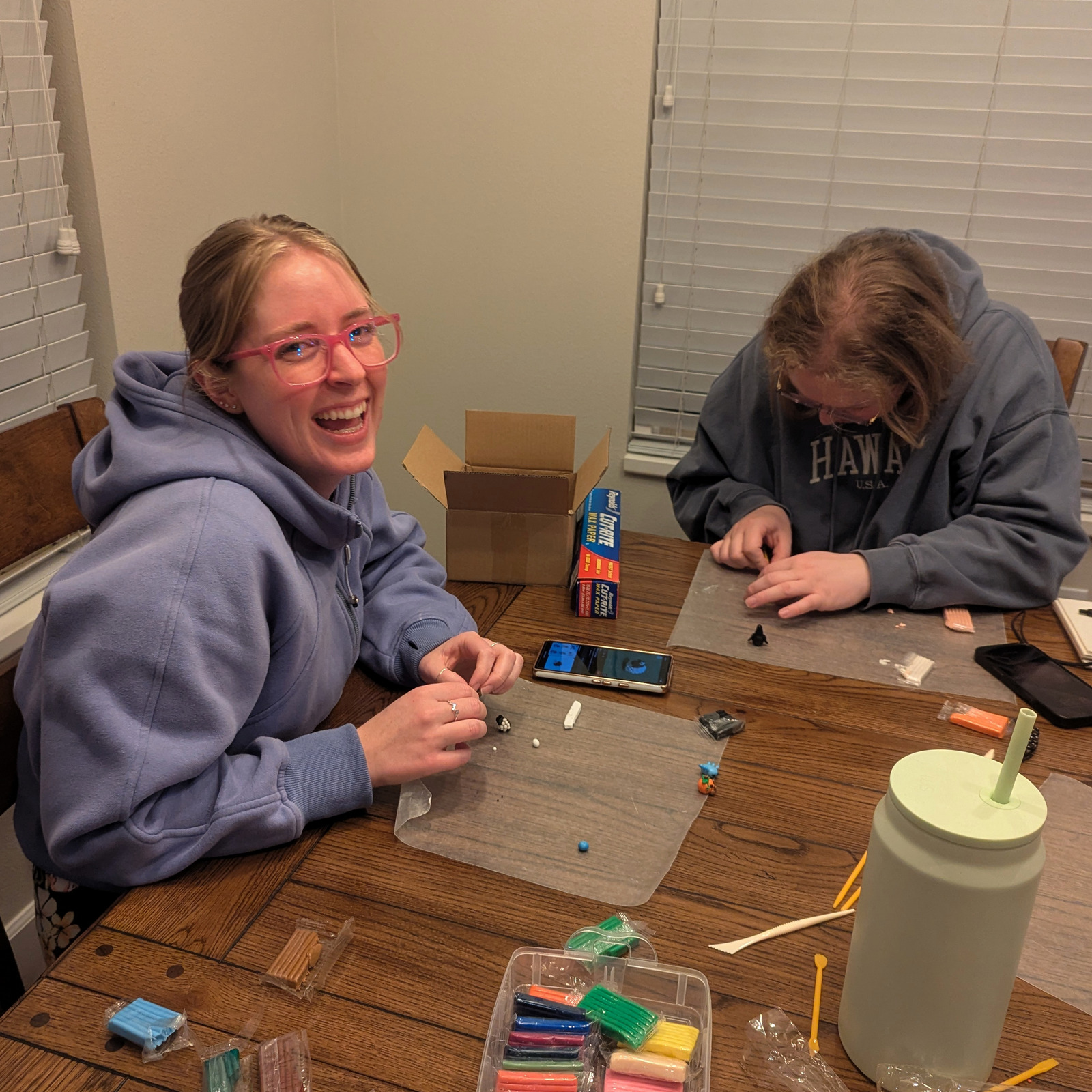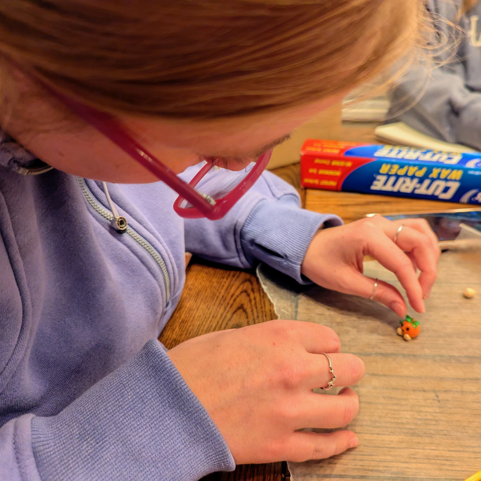 We had a few days and enjoyed time together. Zack introduced us to his clay. Let me explain: on a date a few weeks ago, he and his friend bought some modeling clay and made little figurines. Afterward he ordered a whole set of multi-colored clay, and broke it out when we were there. We spent hours making little things, joking and laughing and admiring each others’ work. Here’s Kyra working on her teeny pumpkin: