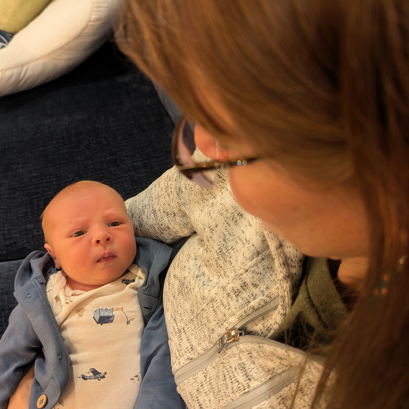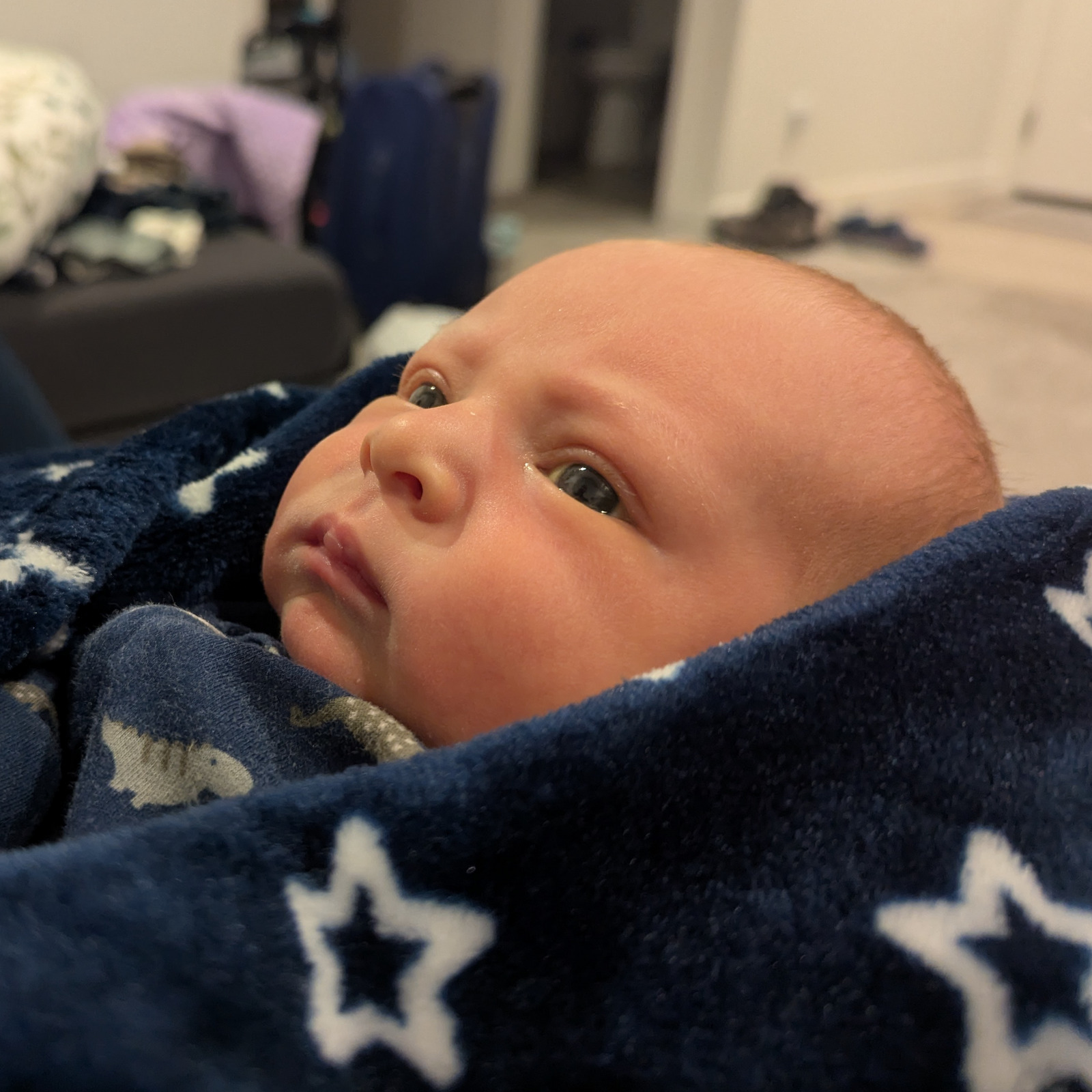 In other news, Kaitlyn had given birth to our second grandchild, William, a few days earlier. We figured she’d want to rest, and so did she, so she and Alex had made plans to basically stay home during Thanksgiving. But the urge to be with family triumphed, and she headed down to visit her parents and siblings for a few days. On her way through town, she dropped in with little William. Here he is, watching his grandma.