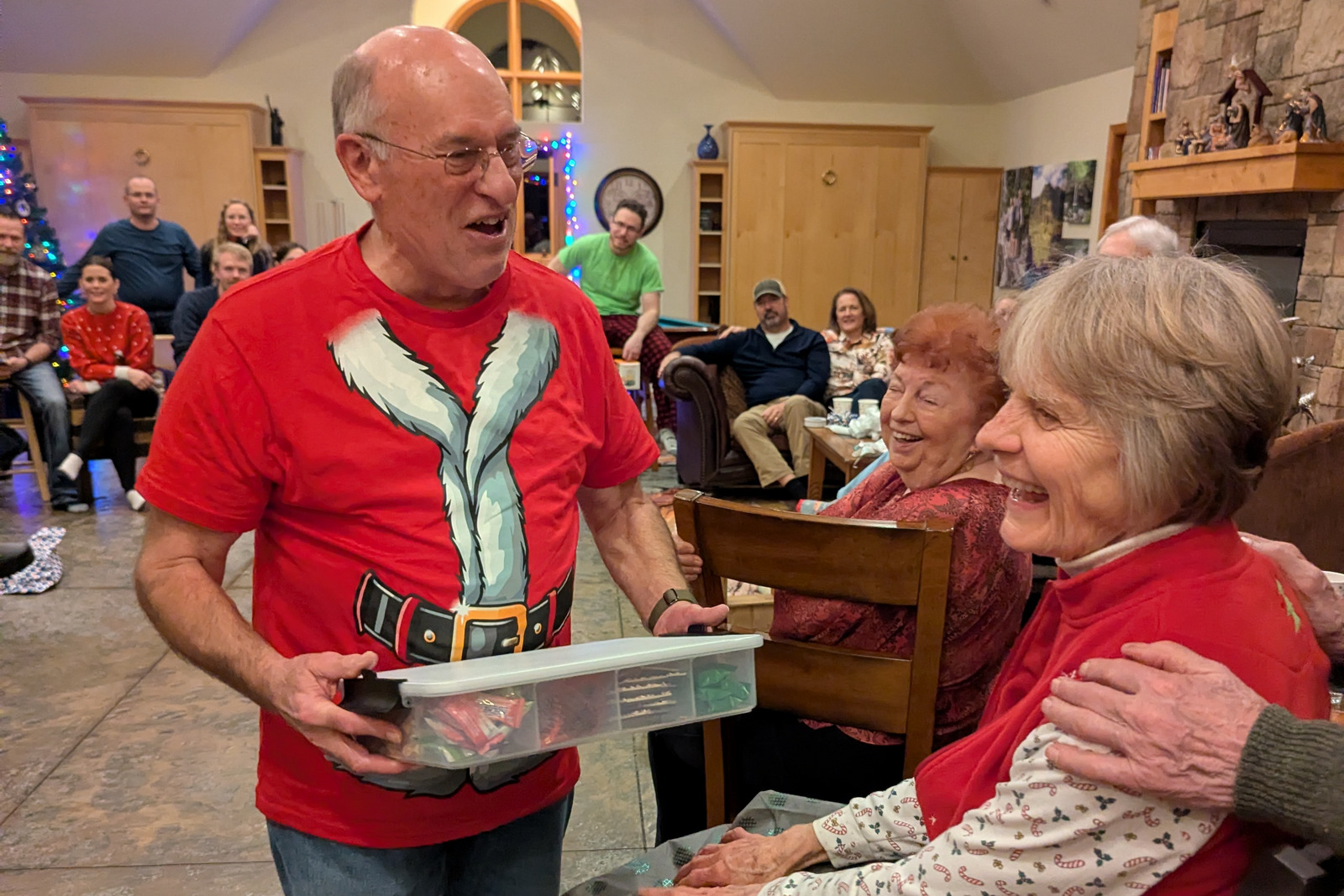 As usual, there were plenty of gag gifts and a lot of horse trading. The “good” gifts– the ones you’d actually be able to use or at least put in your home without complete embarrassment– were frequently stolen. After Tom lost the famous lobster serving bowl, he grabbed a “snacklebox” of treats: