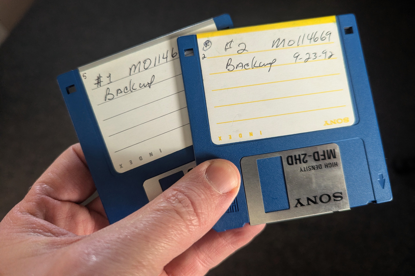 As I began going through the cabinets, drawers, shelves, and file folders, the weight of history gradually became apparent. I’d already seen the old WordPerfect software manual (I used WordPerfect back in the mid-1990s and it was a great word processor). But then I came across some 3.5″ floppy disks with backups dated 1992: