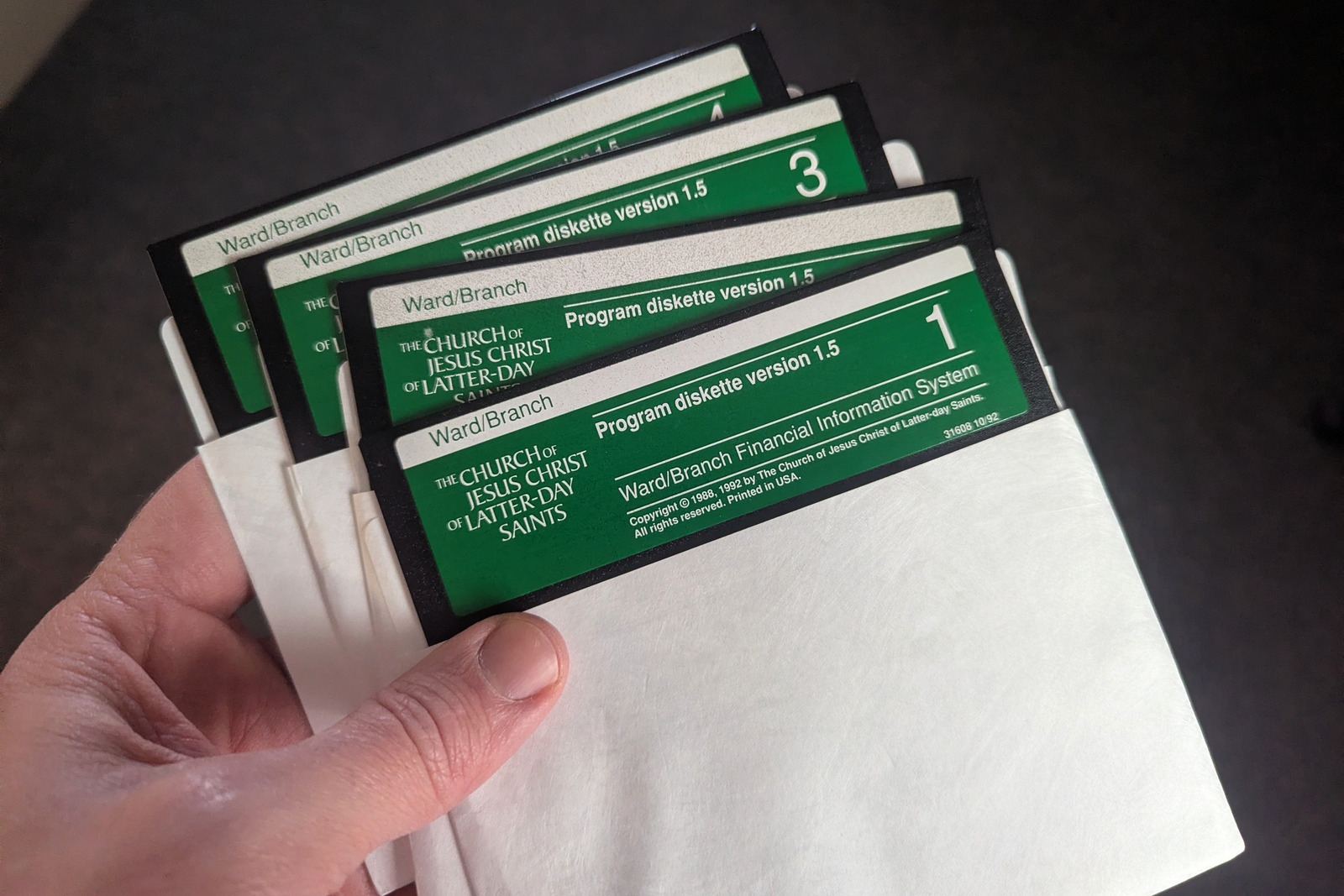 Deeper in that cabinet was something even older: a set of four 5.25″ floppy disks used to install church financial software!