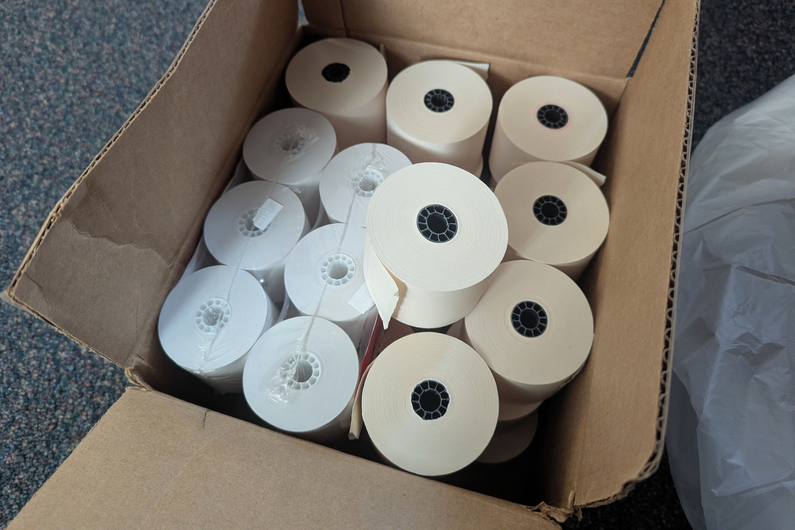 I kept going. I went for some more trash bags. The pile was getting bigger. Tucked in the back of a cabinet was a box of paper rolls for adding machines…