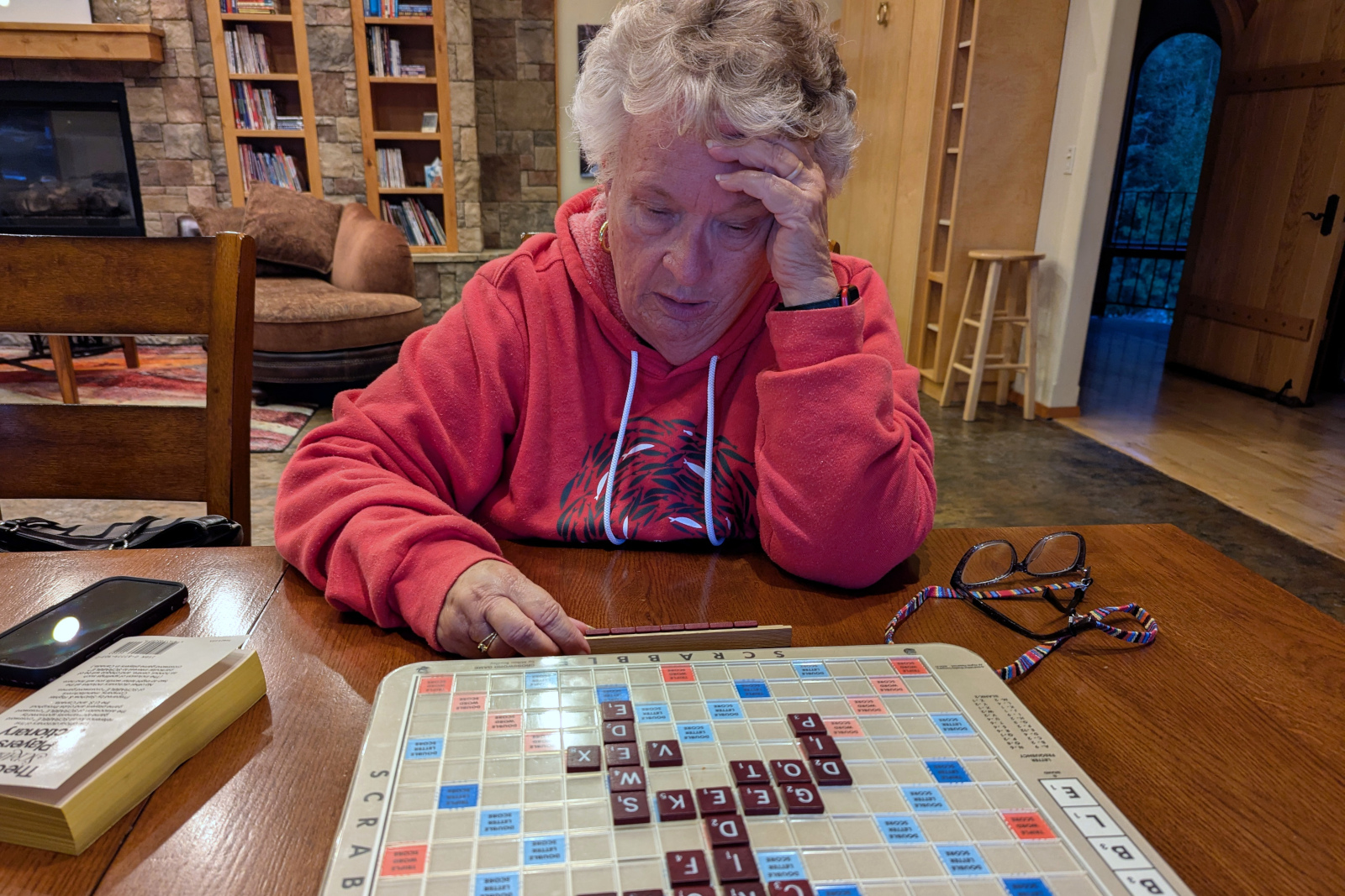 She looks like she’s struggling with a word here, but the truth is she absolutely crushed me. She has lots of practice (I haven’t played in years) and knows all those unusual words that are useful in the game but never used in actual spoken English.