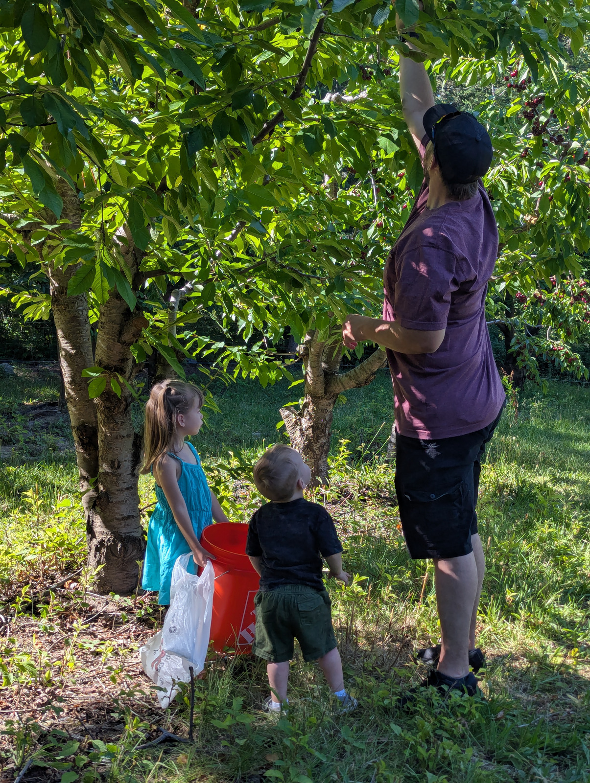 The cherries in our orchard are a little short of fully ripe, but that doesn’t mean you can’t pick them and enjoy a bit of tart flavor. The kids loved the opportunity to grab fistfuls of them from the trees, which were heavily laden this season.
