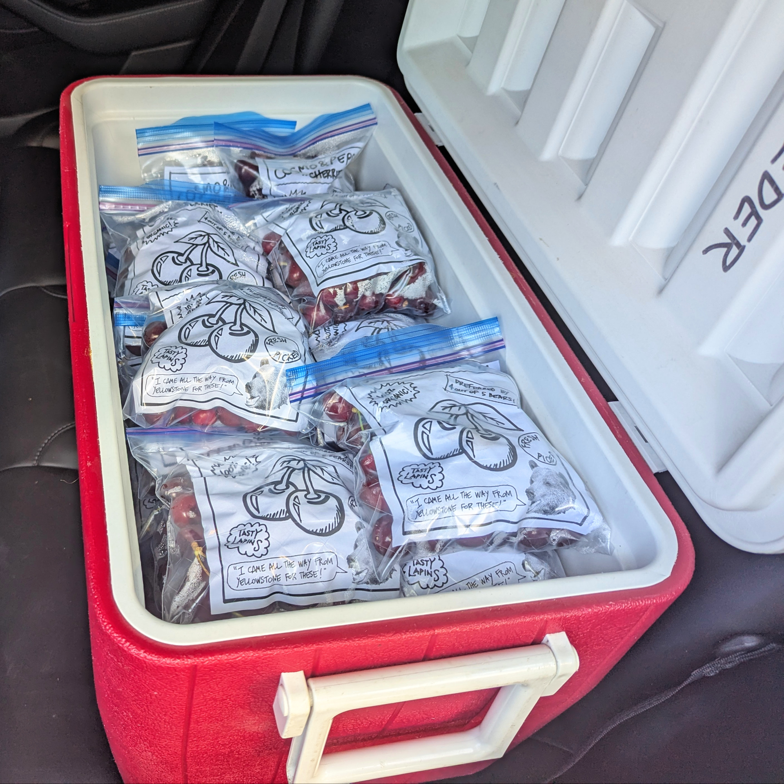 As is tradition, I wanted to deliver our delicious fruit to friends. I spent about an hour picking a single tree, and ended up with at least fifty pounds of cherries! I cleaned and bagged them, threw everything into a cooler, and headed out.