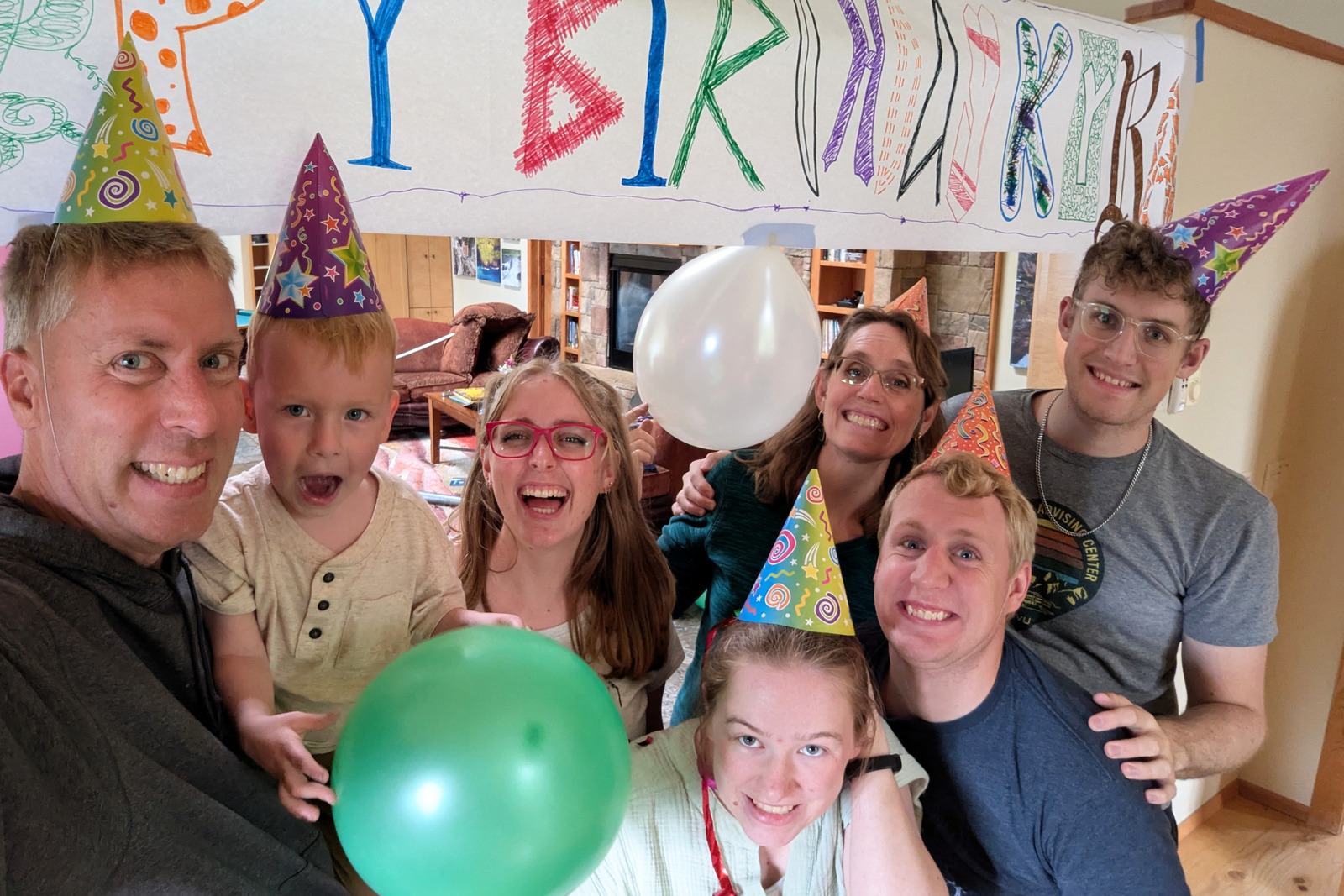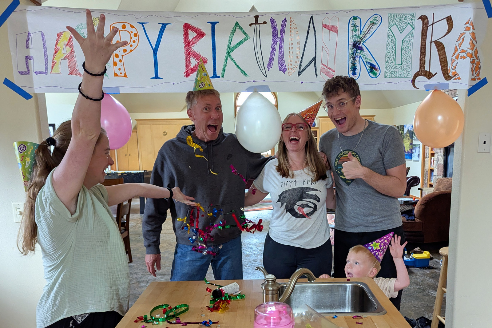 We threw a little surprise birthday party for Kyra today. She was at work all day (kind of a bummer on your birthday) so we spent some time making a big banner, picking up some party hats and confetti, and preparing a special steak dinner. When she came home we jumped out, yelled surprise, and blew up the confetti. Kaitlyn is actually throwing hers, because the canister didn’t work…