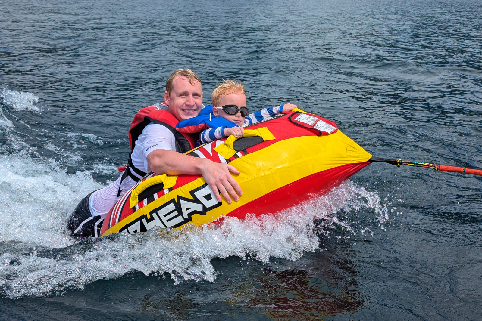 We also pulled out the tube and he rode for a while with Alex (he wasn’t interested in riding alone). I’m not sure he’s having as much fun here.