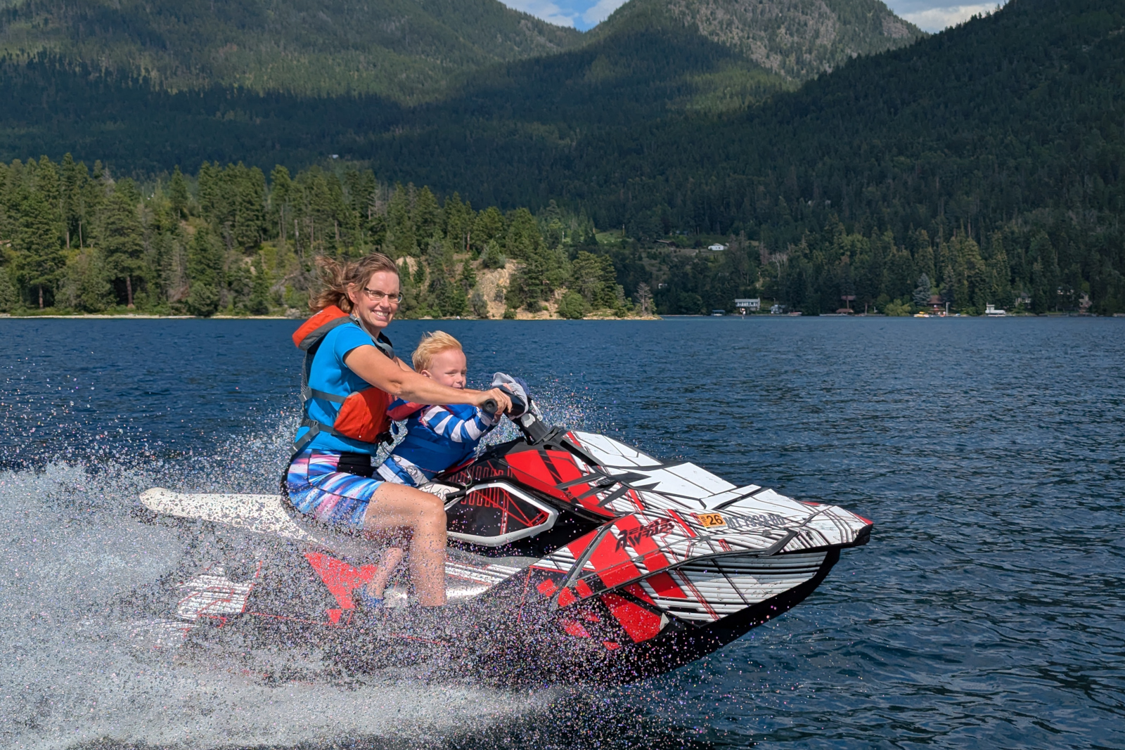 Everyone who visits in the summer wants to head out on the lake, and since that’s one of the reasons we moved here in the first place, we love the opportunity for time on the water. Ollie is older now and enjoys riding the jet skis. Here he is zipping across the water with Grandma: