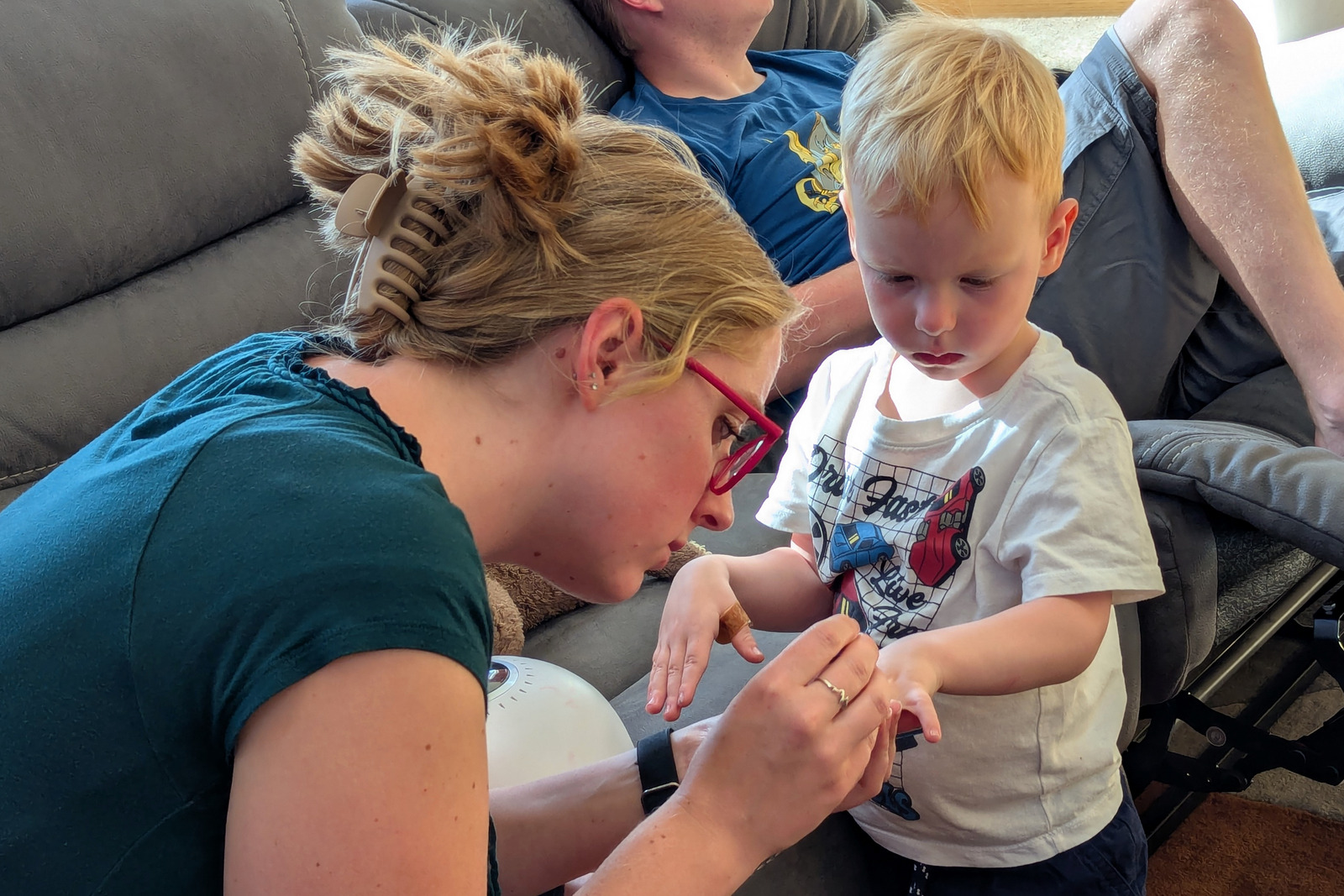 Apparently it’s a tradition when Kyra and Ollie get together that Ollie has his fingernails painted. Sure enough, he asked Auntie Kyra if she’d paint them, and after selecting a nice purple color, she went to work.