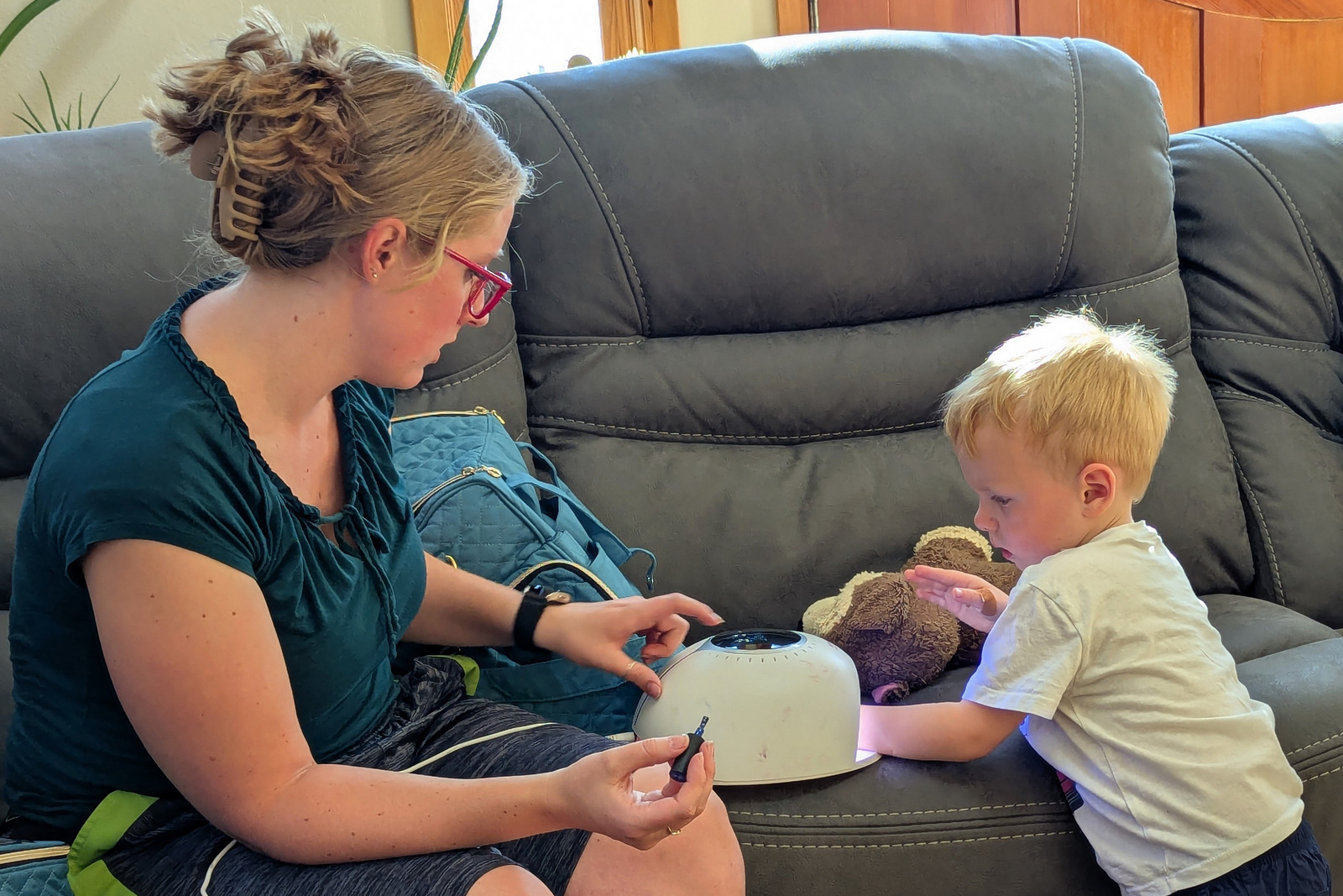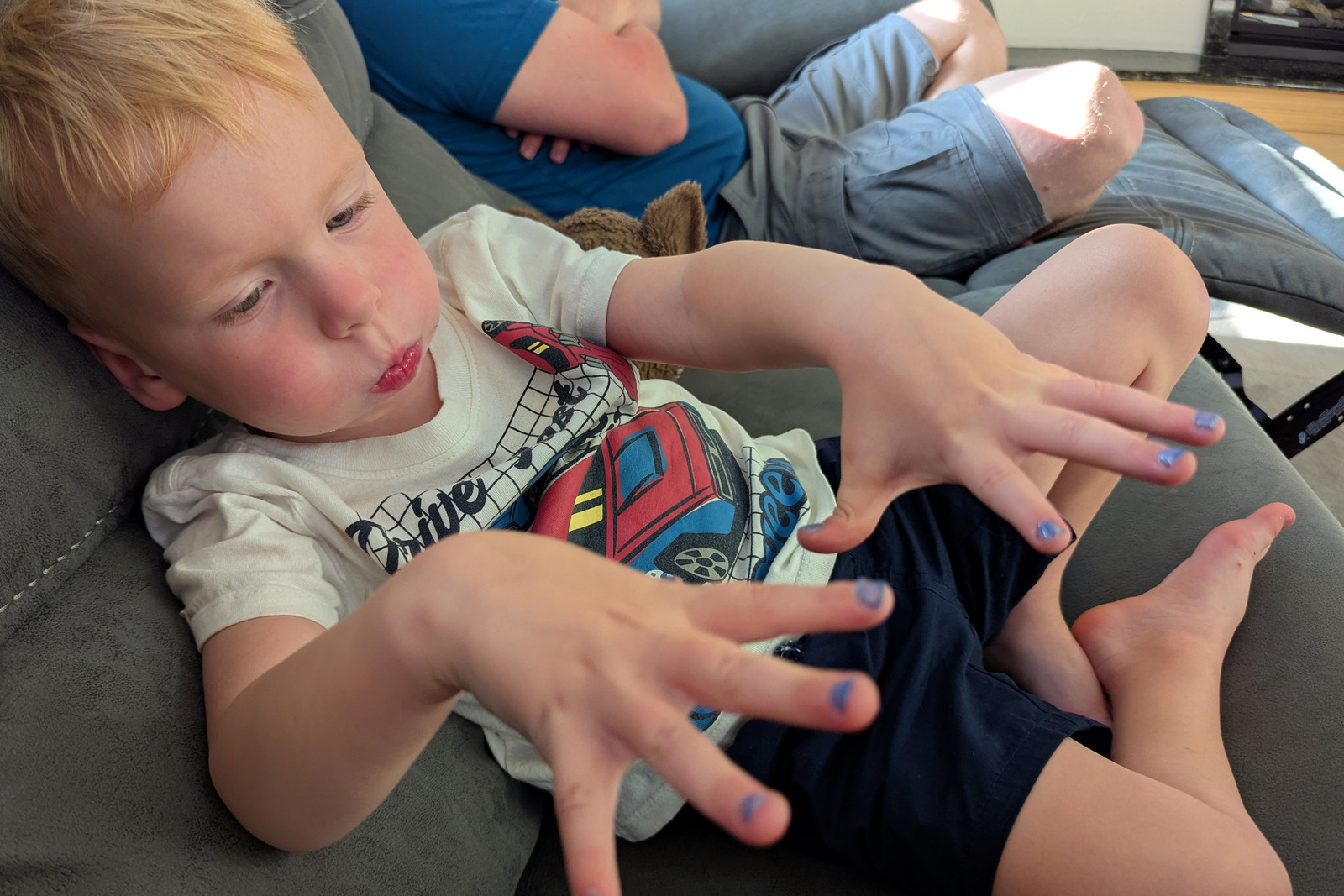 For a boy who’s normally full of energy and running or jumping everywhere, he’s surprisingly quiet and calm for this. After the first coat, I guess you have to put your hands in the magic box to cure the polish (or something).