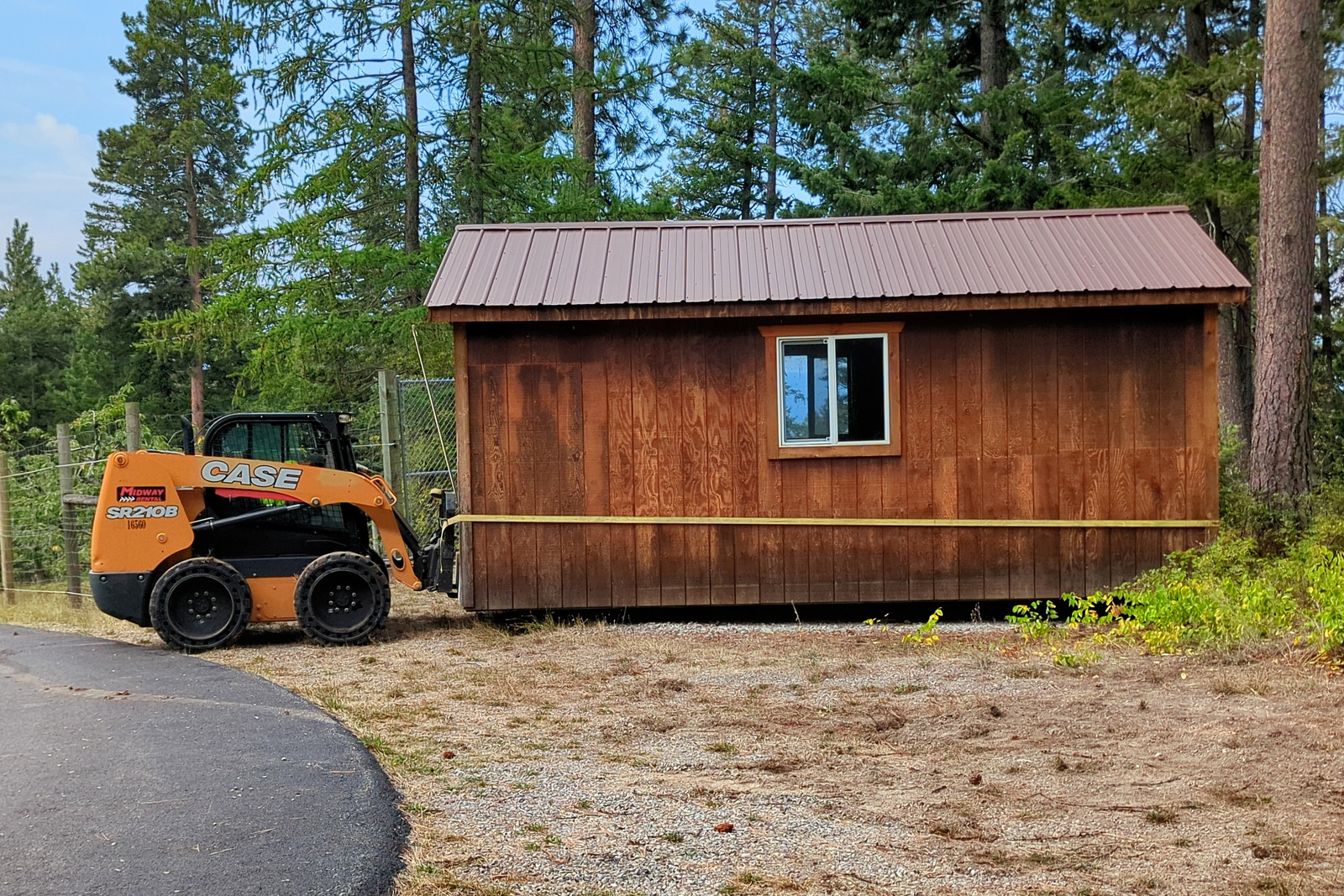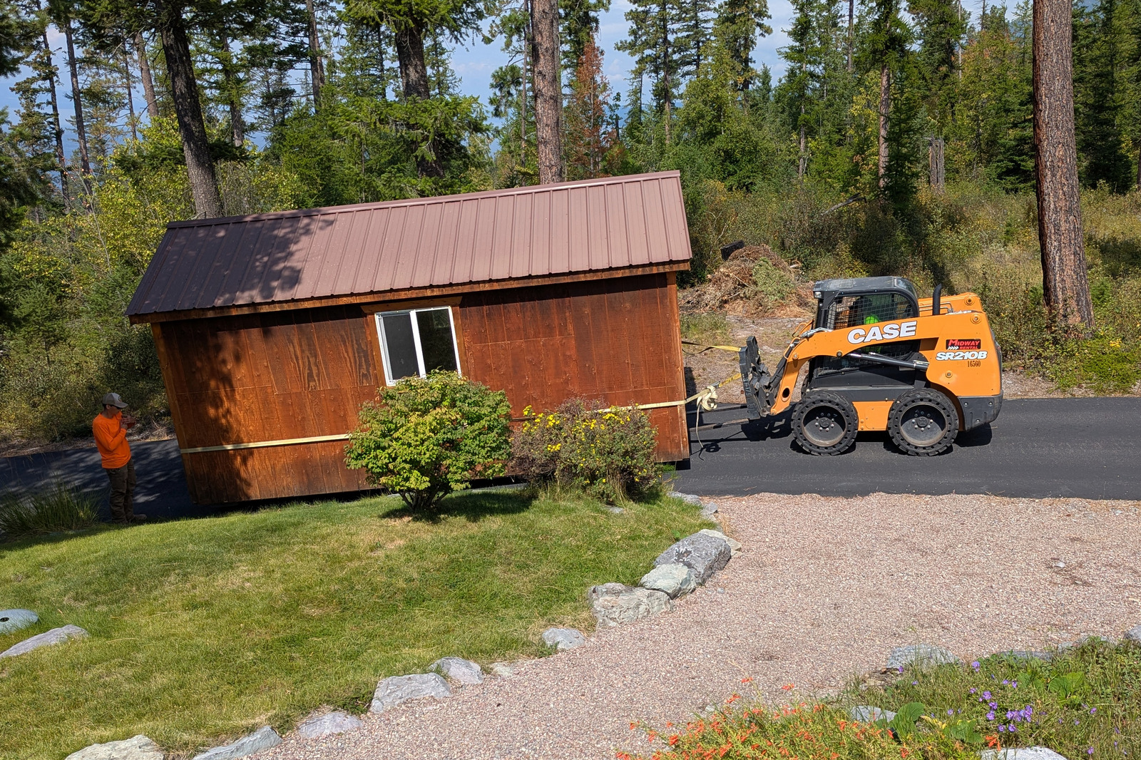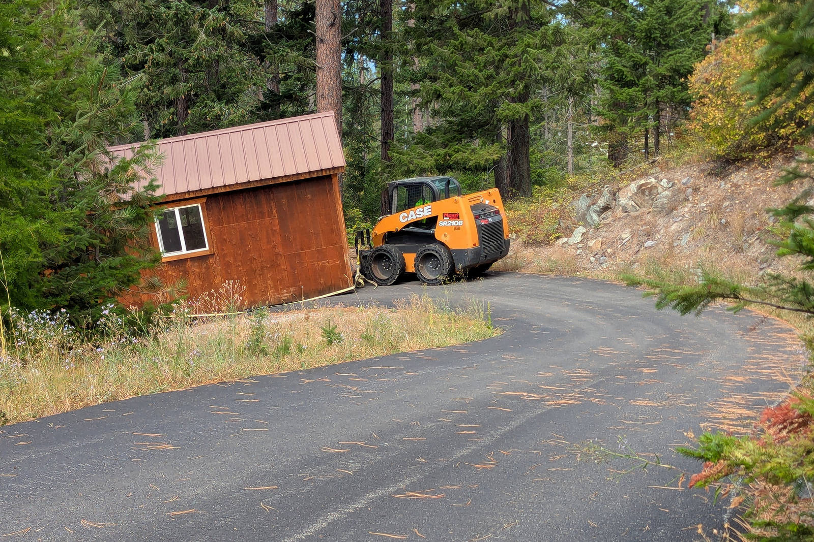 It took them over three hours to maneuver the shed up the driveway. Not surprisingly, the switchbacks were the worst, requiring constant twists and turns and adjustments.