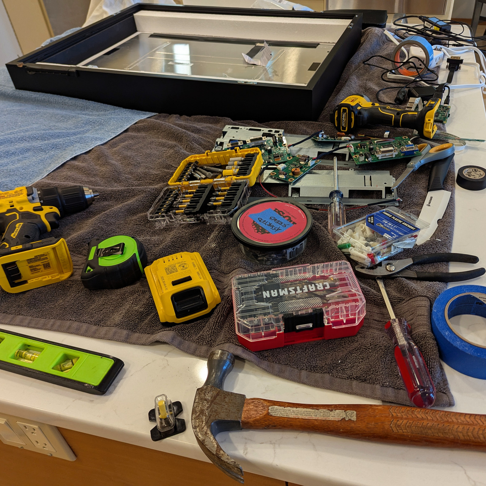 I bought a shadow box– basically a large, thick wooden frame. I had a custom photo mat cut to fit the shadow box and frame the monitor. Then I disassembled the monitor, leaving nothing but the LCD panel and some circuit boards. A spare Raspberry Pi from a closet completed the technical setup: it has HDMI output so I could just plug it into the monitor, bury everything in the shadow box, and run a cord to an outlet.