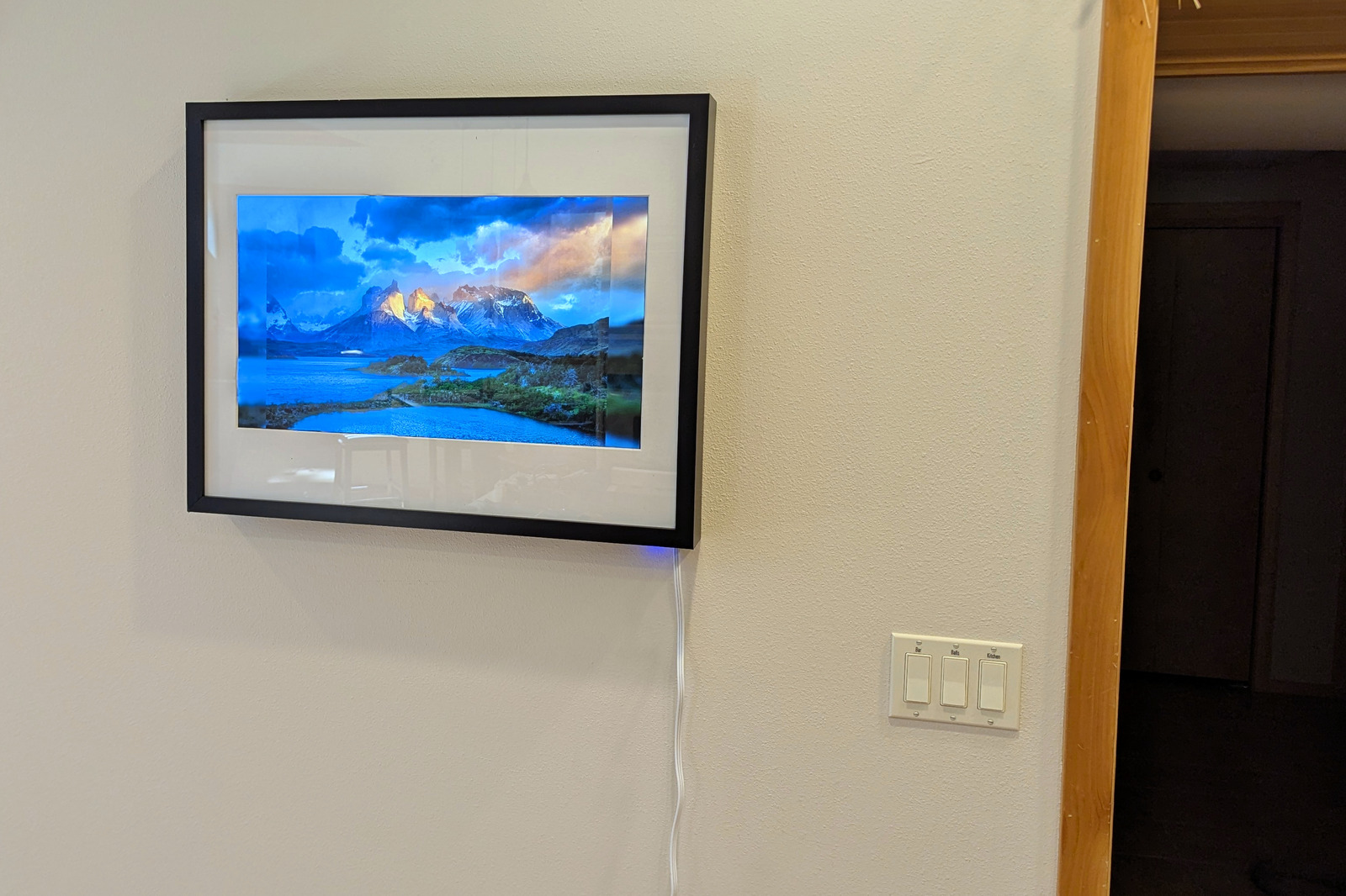 It turned out to be a little more complicated than that, but not much. I wired everything together, mounted the frame on the wall, and tested it with a nice landscape photo: