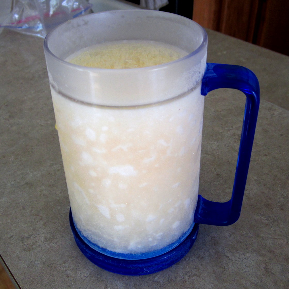 Many years ago, Thom picked up a couple of cheap cooler mugs at his local Big Lots. They were sweet mugs with hollow sides filled with water. You keep them in the freezer, where the water (obviously) turns to ice, and then when you pour a nice cool beverage into the mug, you can keep it cool without the need for ice cubes to water it down.