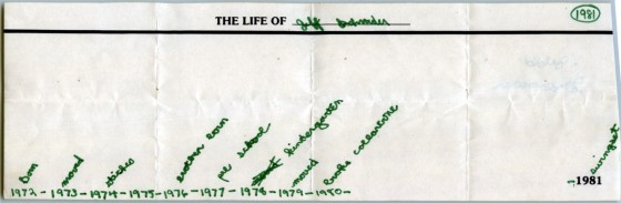 It’s funny to see that I failed to mention either of my sisters being born, but apparently Thom’s birth was momentous. Or maybe I couldn’t think of anything else for 1976? And I guess the swingset in our backyard was a pretty big deal, since it made the list in 1981.