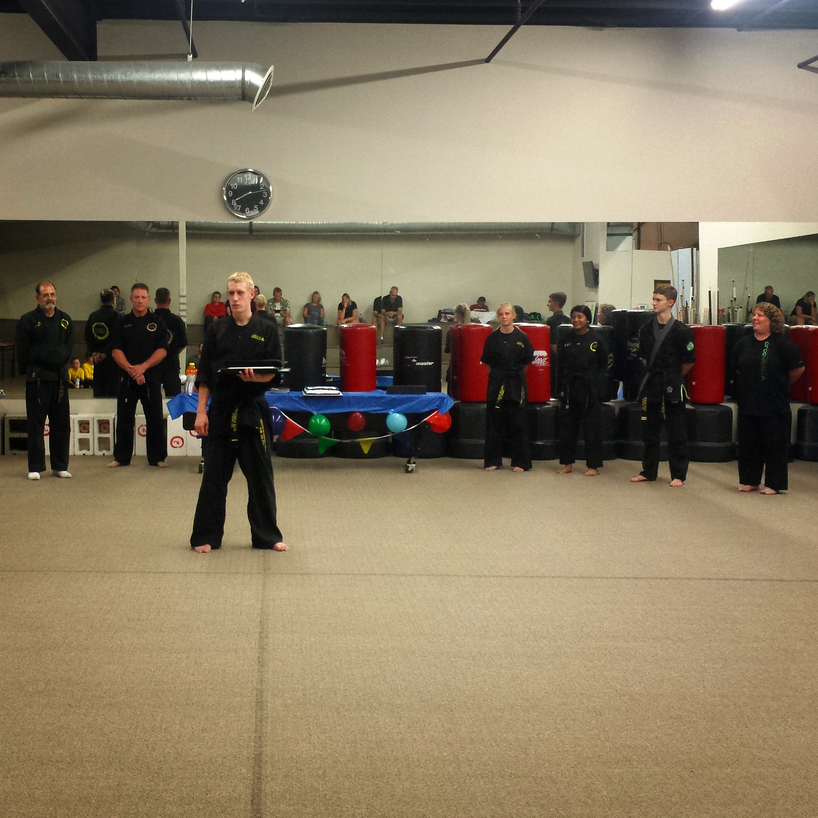 The instructors and several other black-belt students all congratulated him with brief speeches, talking about how dedicated Alex was and how much work he put into these classes. And here he is with his awards and new belt!